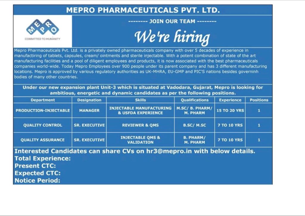 Under our new expansion plant Unit-3 which is situated at Vadodara, Gujarat, Mepro is looking for ambitious, energetic and dynamic candidates as per the following positions.