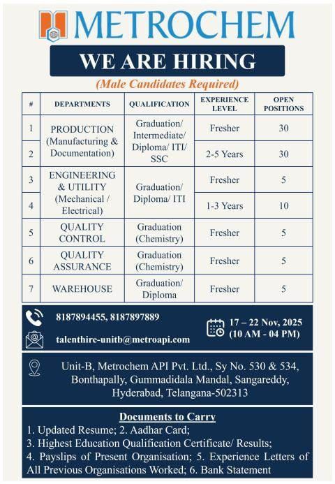 Metrochem API Pvt. Ltd., located in Bonthapally, Gummididala Mandal, Sangareddy, Hyderabad, Telangana, is seeking motivated Male Candidates to join our growing team. We have numerous open positions across various departments, offering roles for freshers and experienced professionals alike.