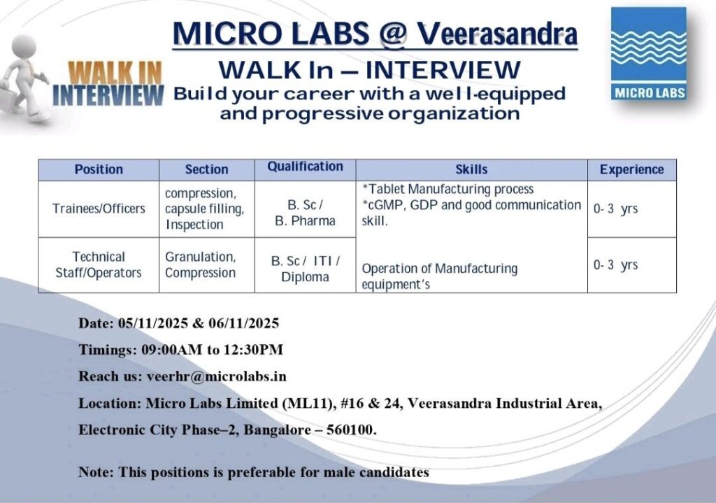 Micro Labs Limited, a prominent name in the Indian pharmaceutical industry, has announced a two-day walk-in interview event for aspiring candidates looking to launch or advance their careers in pharmaceutical manufacturing. The drive will be held at the company’s state-of-the-art facility in Veerasandra, Bangalore.