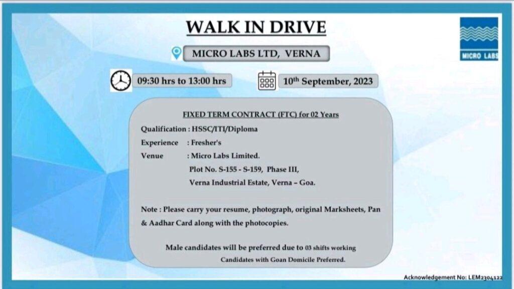 Micro Labs Limited Walk In Drive on 10th September, 2023 for freshers