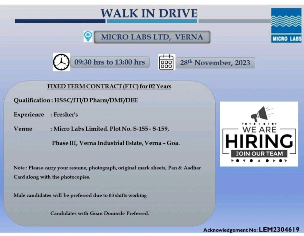 Walk-in Interview** For **Micro Labs Limited** on **28th November 2023** between **9:30am to 1pm**
