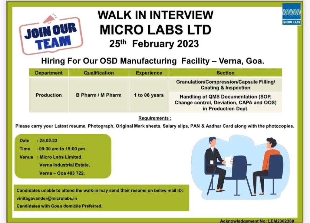 Micro Labs Limited- Walk In Interview for OSD Manufacturing Facility – Verna, Goa on 25th Feb 2023