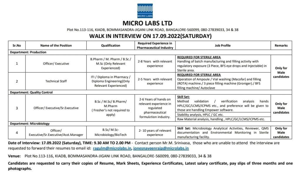 Date of Interview: 17.09.2022 (Saturday), TIME: 9.30 AM TO 2.00 PM – Contact person Mr.M. Srinivasa, those who are unable to attend the interview are requested to forward their resumes to email id: ragulm@microlabs.in, jonesnaveenraip@microlabs.in