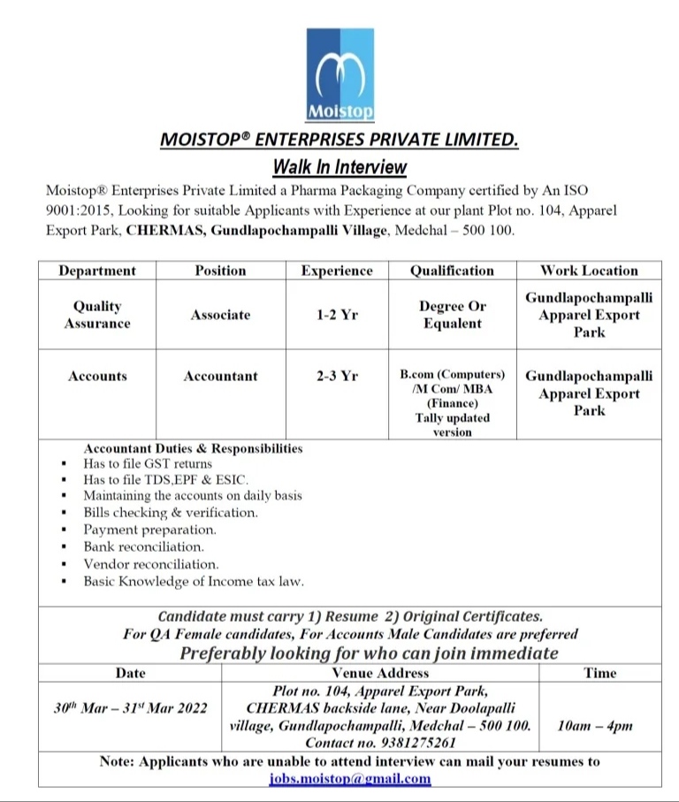 Moistop® Enterprises Private Limited a Pharma Packaging Company certified by An ISO 9001:2015, Looking for suitable Applicants with Experience at our plant Plot no. 104, Apparel Export Park, CHERMAS, Gundlapochampalli Village, Medchal – 500 100.