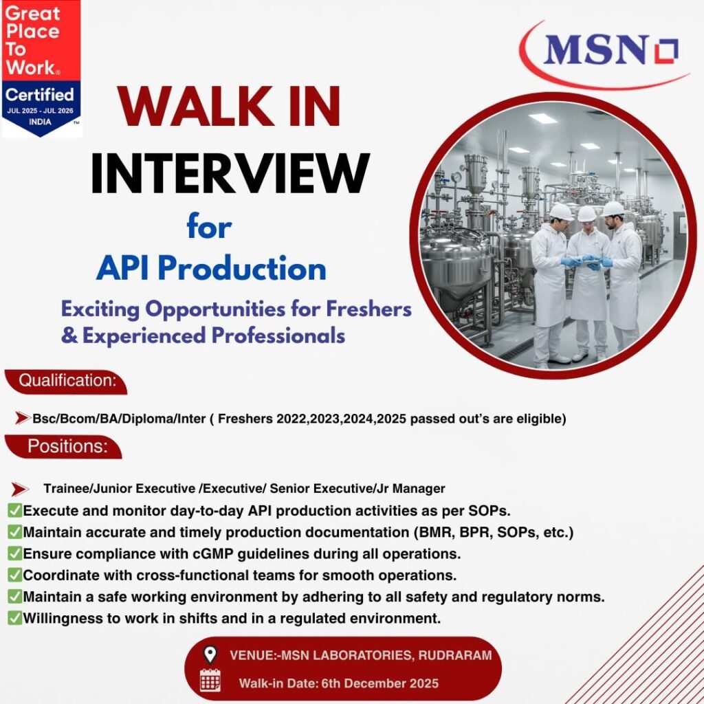 MSN Laboratories, one of India’s leading pharmaceutical companies and a certified Great Place to Work (2025–2026), has announced a walk-in interview drive for multiple positions in API Production. This drive presents an excellent opportunity for both fresh graduates and experienced professionals looking to build a rewarding career in the pharma manufacturing sector.