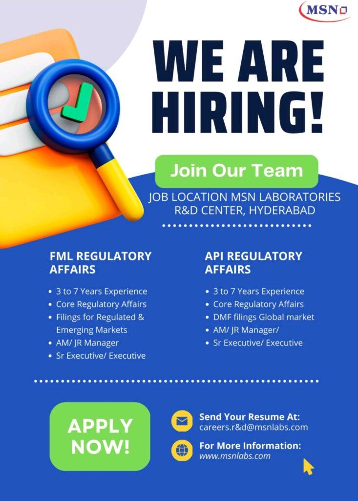 MSN Laboratories- Hiring for Regulatory Affairs department – Apply Now