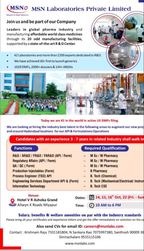 MSN Laboratories Private Limited Walk In Interview for R&D/AR&D/FR&D / FAR&D (API / Form) Regulatory Affairs (API/Form)/ QA/QC (Form)/ Production Injectables (Form)/ Process Engineer (TSD) API