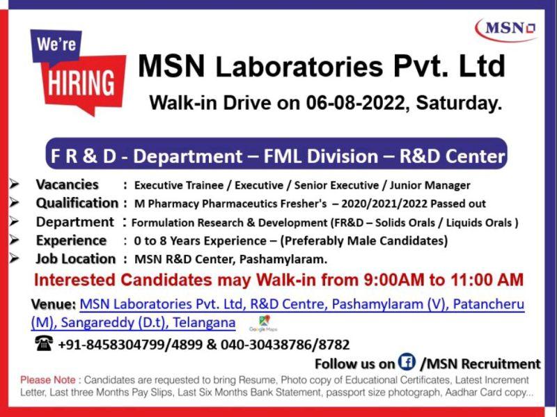 MSN Laboratories Pvt. Ltd Walk-in Drive for 0 to 8 Years Experience -M Pharmacy Fresher’s – 2020/2021/2022 Passed out on 06-08-2022, Saturday