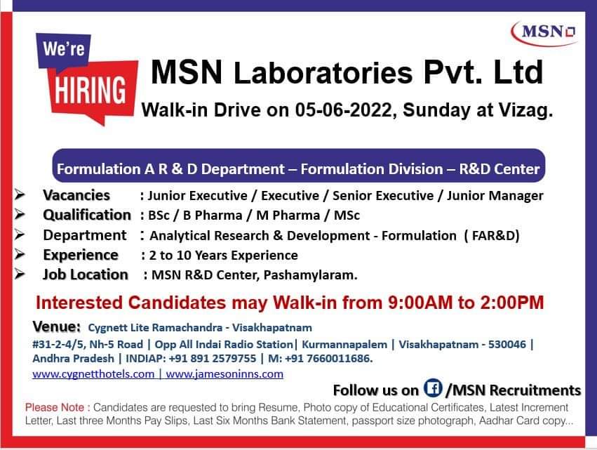 MSN Laboratories Pvt. Ltd Walk-in Drive on 05-06-2022, Sunday at Vizag.