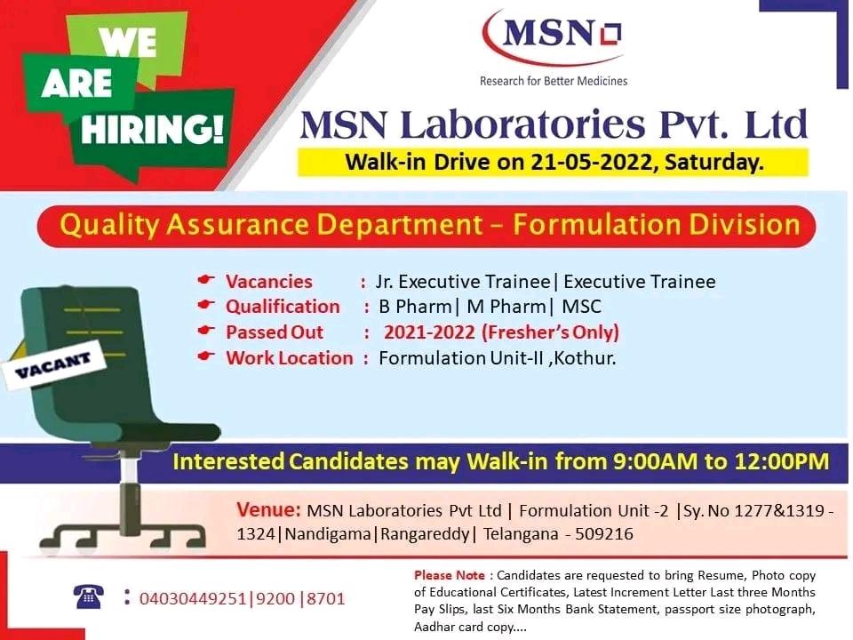 MSN Laboratories Pvt. Ltd Walk-in Drive for Fresher’s -B Pharm, M Pharm, MSC on 21/05/2022