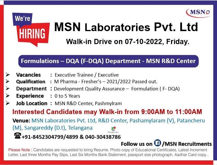 MSN Laboratories Pvt. Ltd Walk-in Drive on 07-10-2022, Friday.
