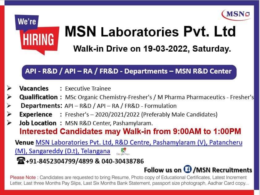 MSN Laboratories Pvt. Ltd Walk-in Drive for MSc Freshers / M Pharma Pharmaceutics Fresher’s- 2020/2021/2022 Passed out on 19th March 2022