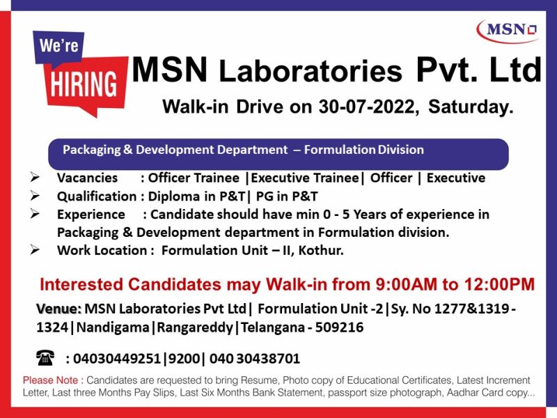 MSN Laboratories Pvt. Ltd Walk In Drive for Officer Trainee, Executive Trainee, Officer, Executive – Packaging & Development Department – Formulation Division on 30th July 2022