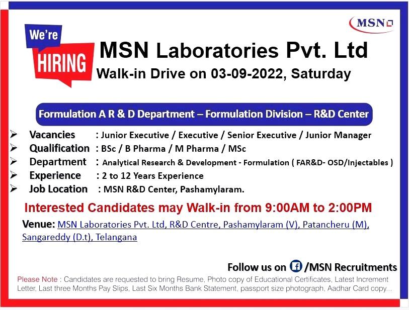 MSN Laboratories Pvt. Ltd Walk-in Drive for RA – API, FAR&D-OSD/Injectables, AR&D, FR&D, Kilo Lab on 03/09/2022