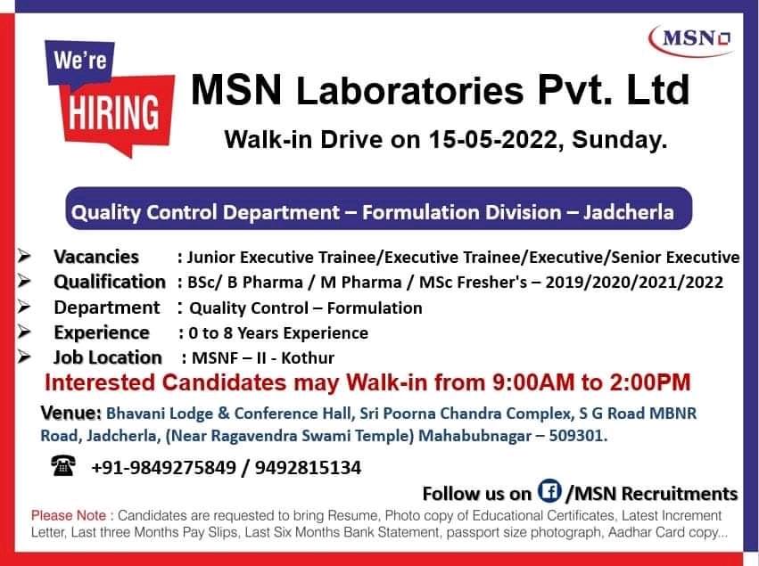 MSN Laboratories Pvt. Ltd Walk-in Drive on 15-05-2022, Sunday || BSc/ B Pharma / M Pharma / MSc Fresher’s