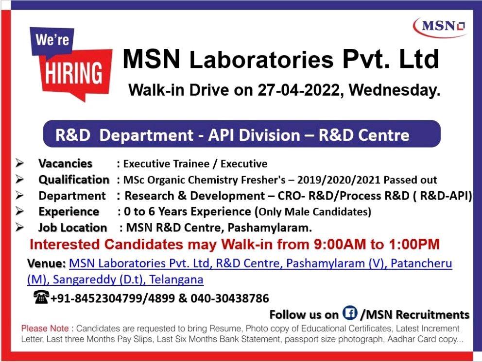 MSN Laboratories Pvt. Ltd Walk-in Drive on 27-04-2022, Wednesday.