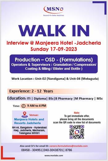 MSN Laboratories Pvt. Ltd Walk In Drive on Sunday 17-09-2023 for Production department