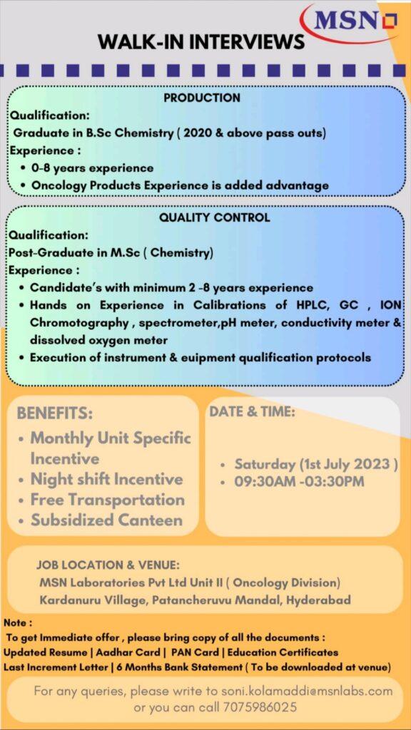 MSN Laboratories Pvt Ltd Walk in Interview for freshers on 1st July 2023