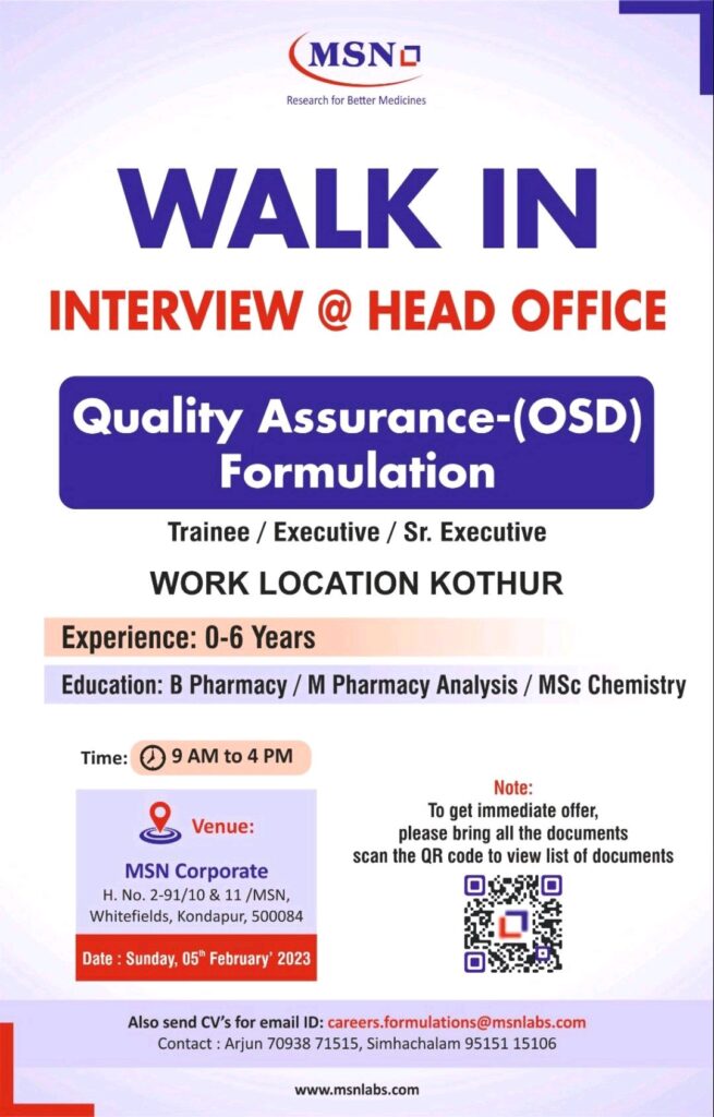 MSN Laboratories Pvt. Ltd- Walk In Interview for Quality Assurance-(OSD) Formulation on Sunday, 05 February’ 2023