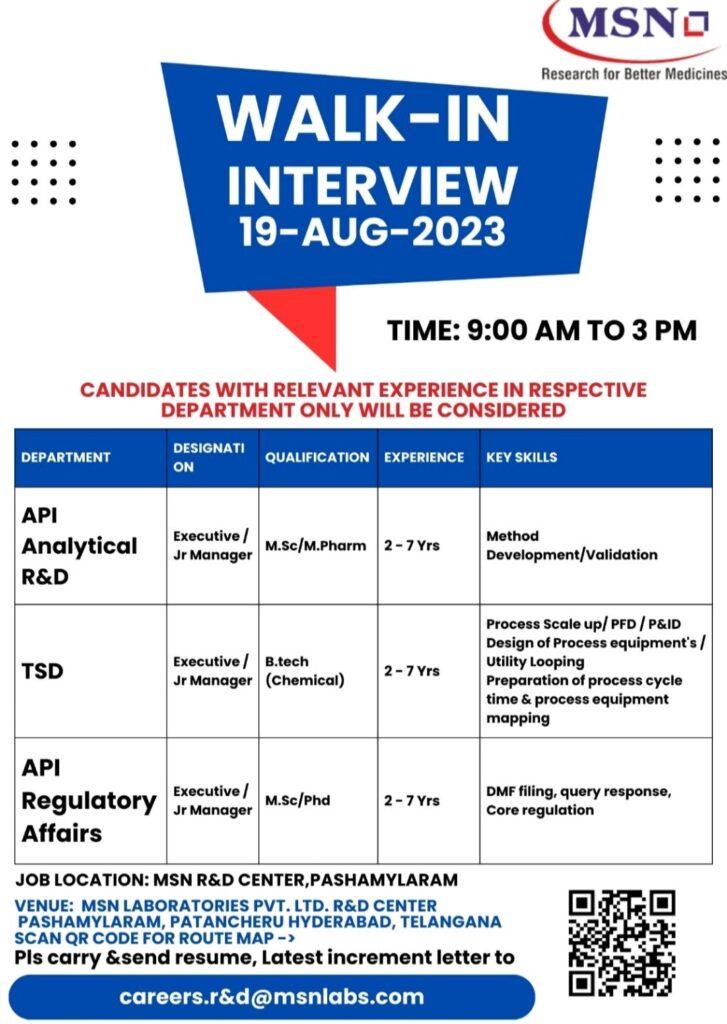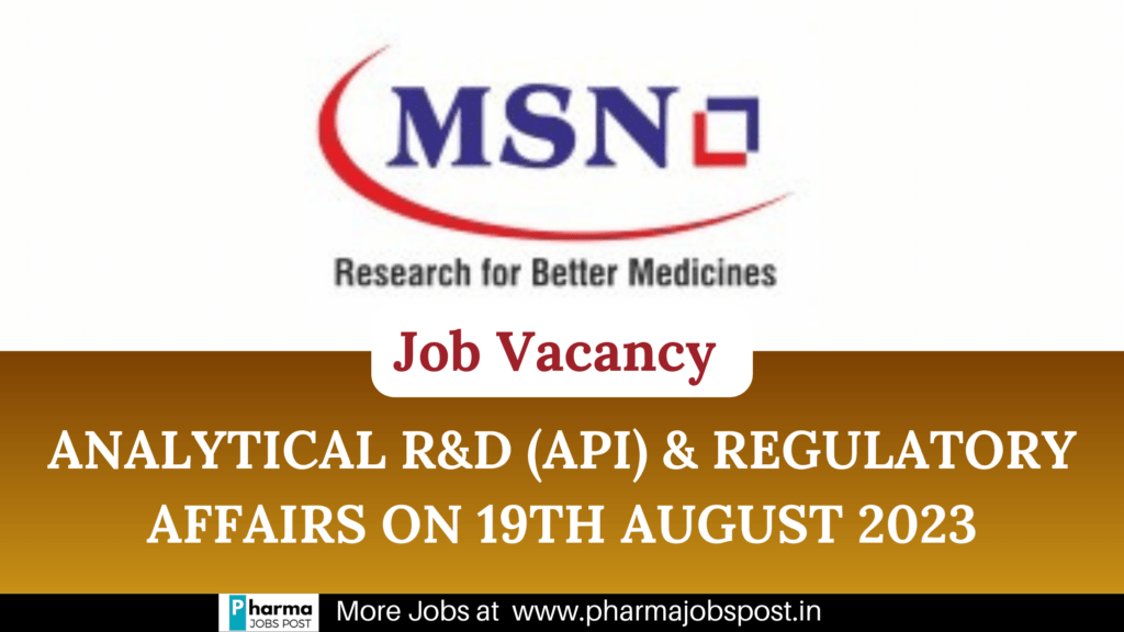 MSN Laboratories- Walk in interview for Analytical R&D (API) & Regulatory Affairs on 19th August 2023