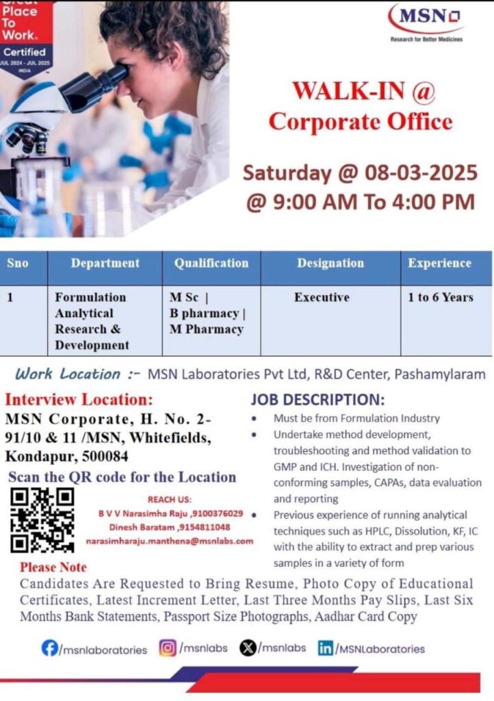 Work Location :- MSN Laboratories Pvt Ltd, R&D Center, Pashamylaram