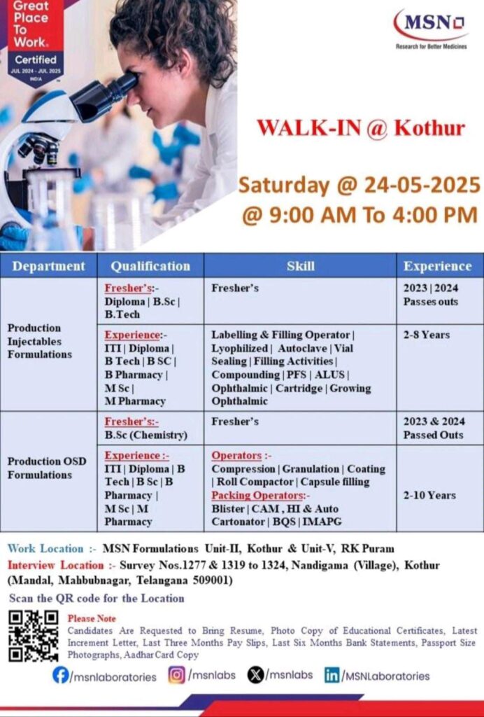Work Location :- MSN Formulations Unit-II, Kothur & Unit-V, RK Puram Interview