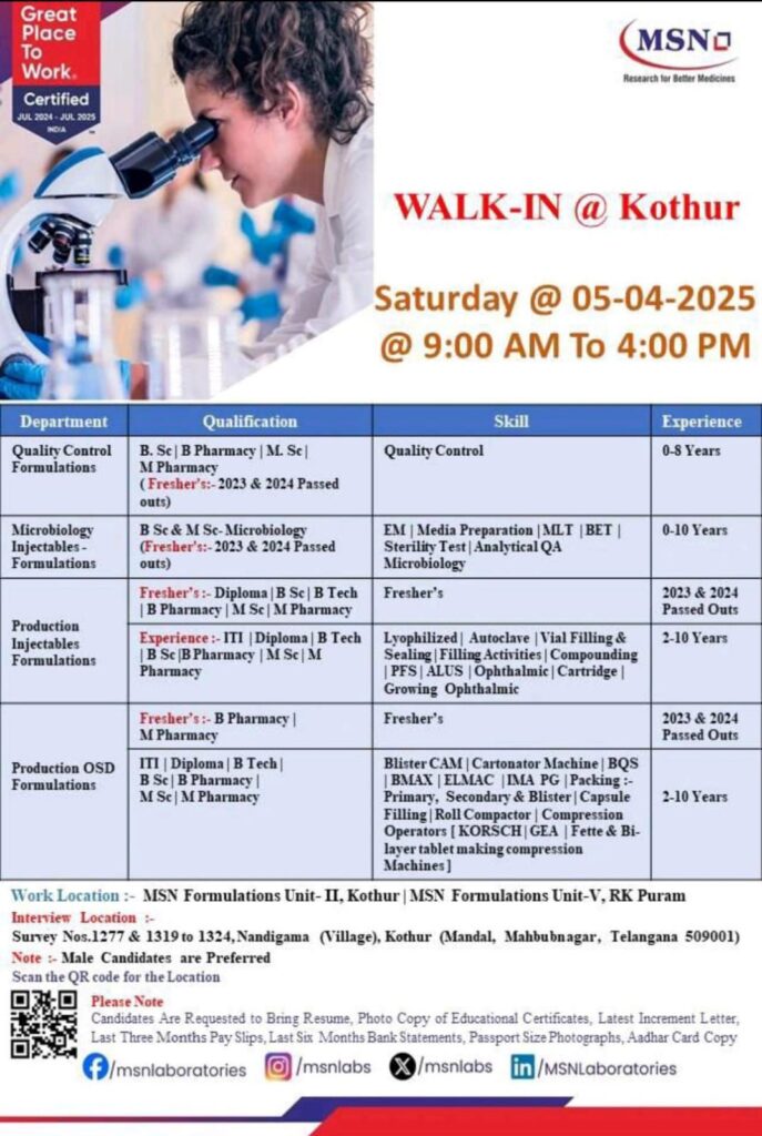 Work Location:- MSN Formulations Unit-II, Kothur | MSN Formulations Unit-V, RK Puram