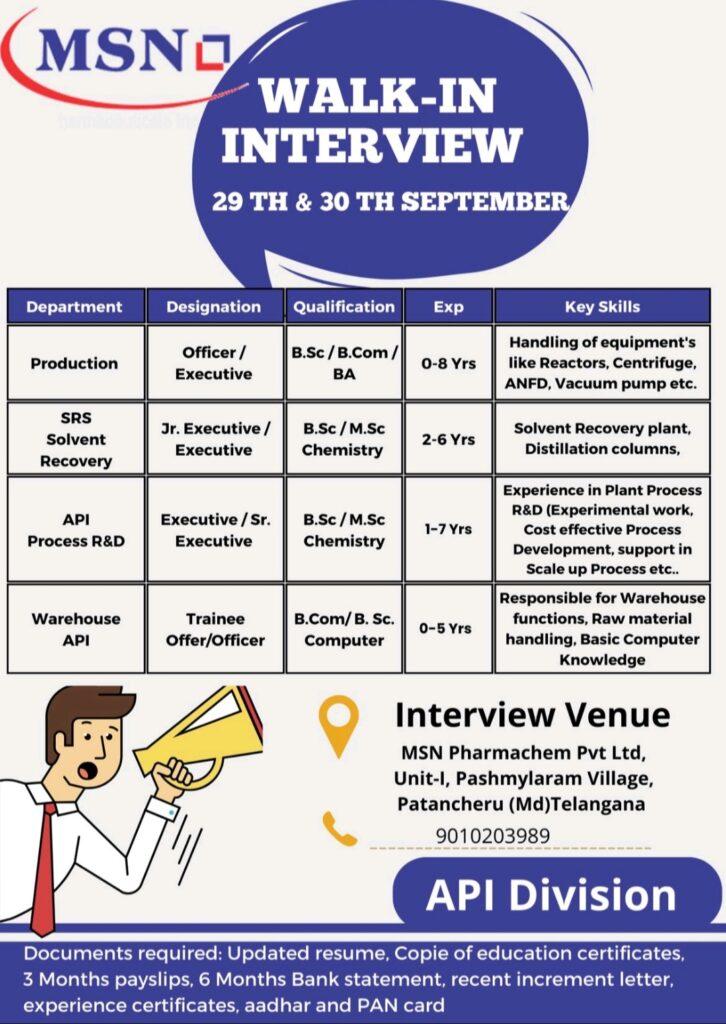 MSN Pharmachem Pvt Ltd Walk In Drive on 29th & 30 th September 2023 for Production, SRS Solvent Recovery, ΑΡΙ Process R&D, Warehouse department