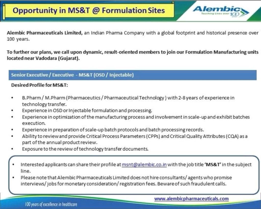 Application Process: Interested candidates should email their profiles to msnt@alembic.co.in with the subject line “MS&T”.