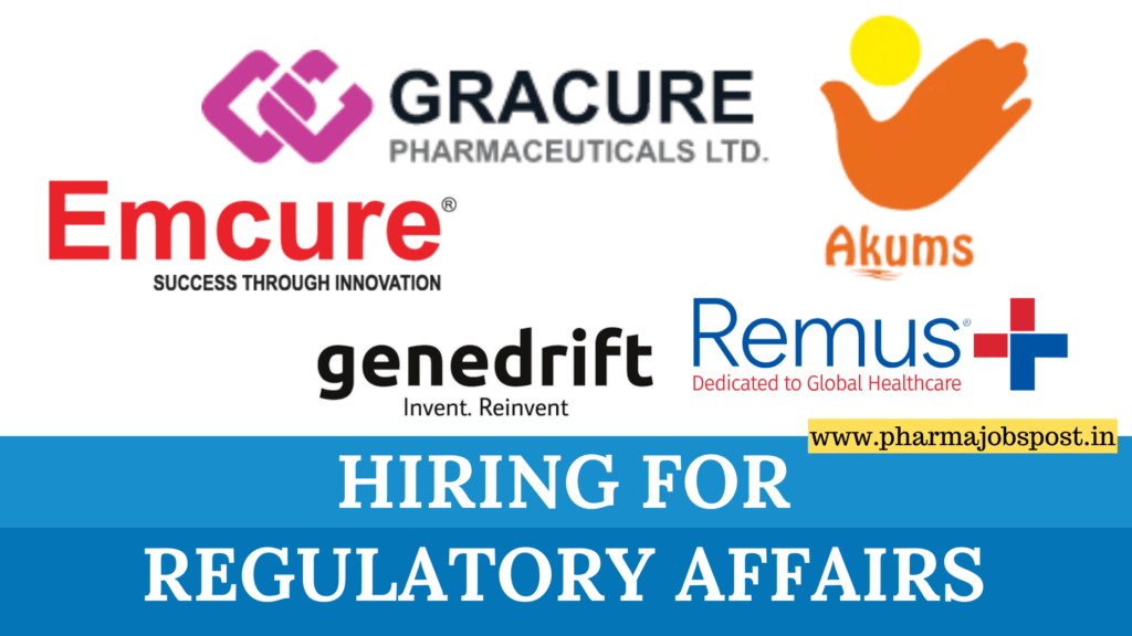 Multiple job vacancy for Regulatory Affairs department @ Emcure, Akums, Genedrift, Gracure, Remus Pharma – Apply Now