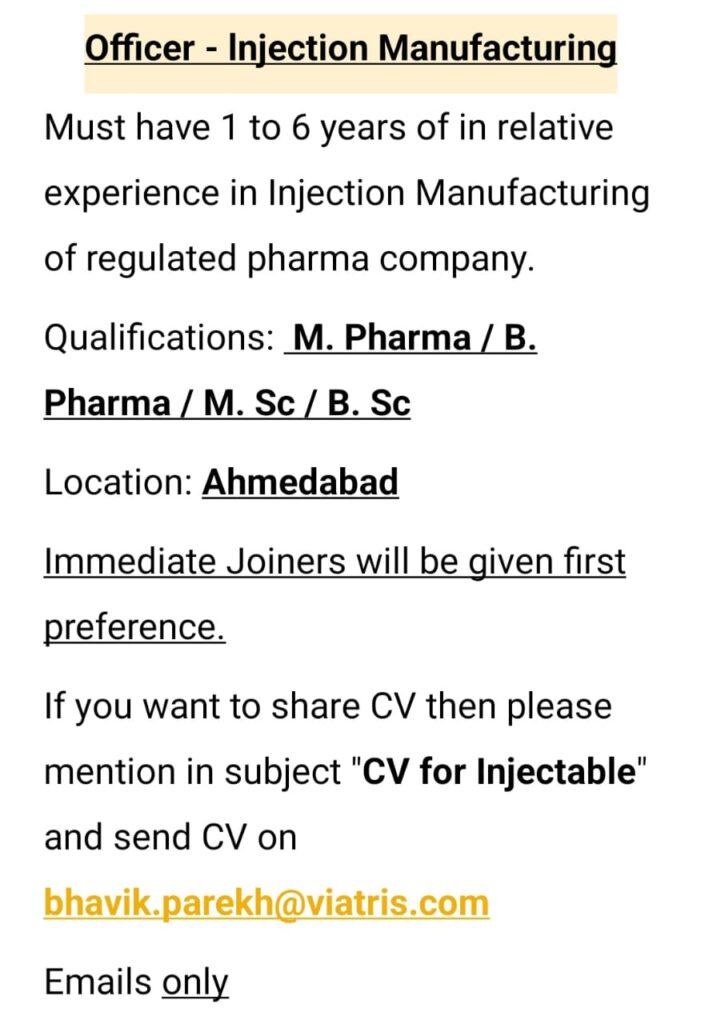 Mylan Laboratories- Job vacancy for Officer – Injection Manufacturing at Ahmedabad