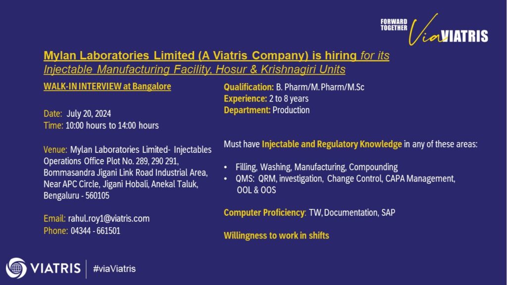 Mylan Laboratories Limited (A Viatris Company) is hiring for its Injectable Manufacturing Facility, Hosur & Krishnagiri Units