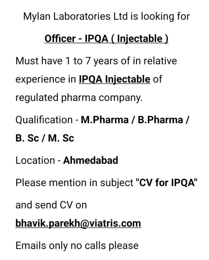 Mylan Laboratories Ltd is looking for Officer – IPQA (Injectable) department