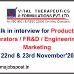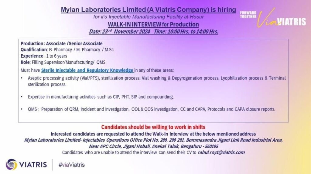 Mylan Laboratories Limited (A Viatris Company) walk-in interview on 23rd November 2024 at Bengaluru for Associate /Senior Associate position in Production department for it’s Injectable Manufacturing Facility at Hosur.