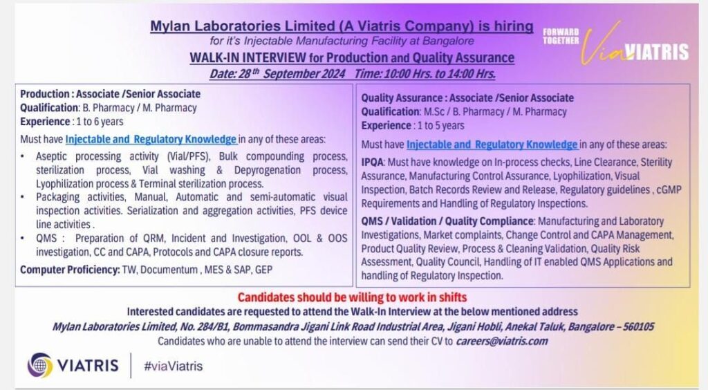 Mylan Laboratories Limited (A Viatris Company) is hiring for it’s Injectable Manufacturing Facility at Bangalore, walk-in interview for Production and Quality Assurance on 28th September 2024.