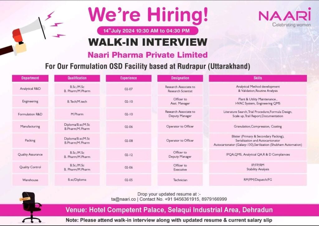 Exciting Opportunity Alert! We are thrilled to announce a Walk-In Drive hosted by Naari Pharma for various positions across our manufacturing plant.