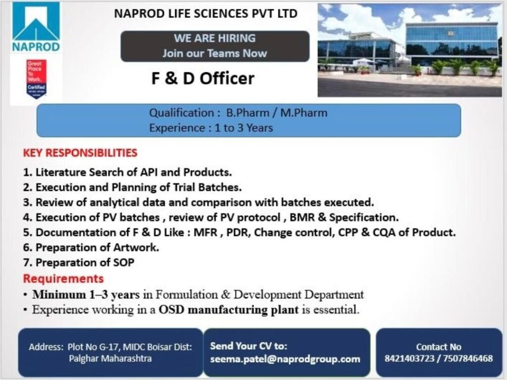 Naprod Life Sciences Pvt Ltd, a certified “Great Place to Work,” is currently expanding its team and looking for a dedicated F&D Officer to join their facility in Palghar, Maharashtra.