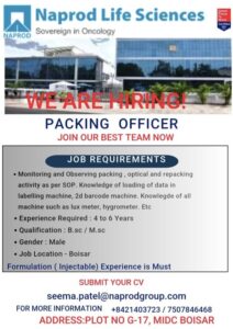 Naprod Life Sciences, a leading and trusted name in the oncology pharmaceutical sector, has announced an exciting job opening for the position of Packing Officer. Known for its excellence and recognition as a Great Place to Work, the company invites skilled professionals to join its dynamic team at the Boisar facility.