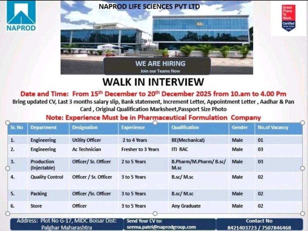 NAPROD LIFE SCIENCES PVT LTD is expanding and seeking highly motivated and experienced professionals to join our team in Boisar, Palghar, Maharashtra. We are conducting a Walk-in Interview for various roles across Engineering, Production, Quality Control, Packing, and Store departments.