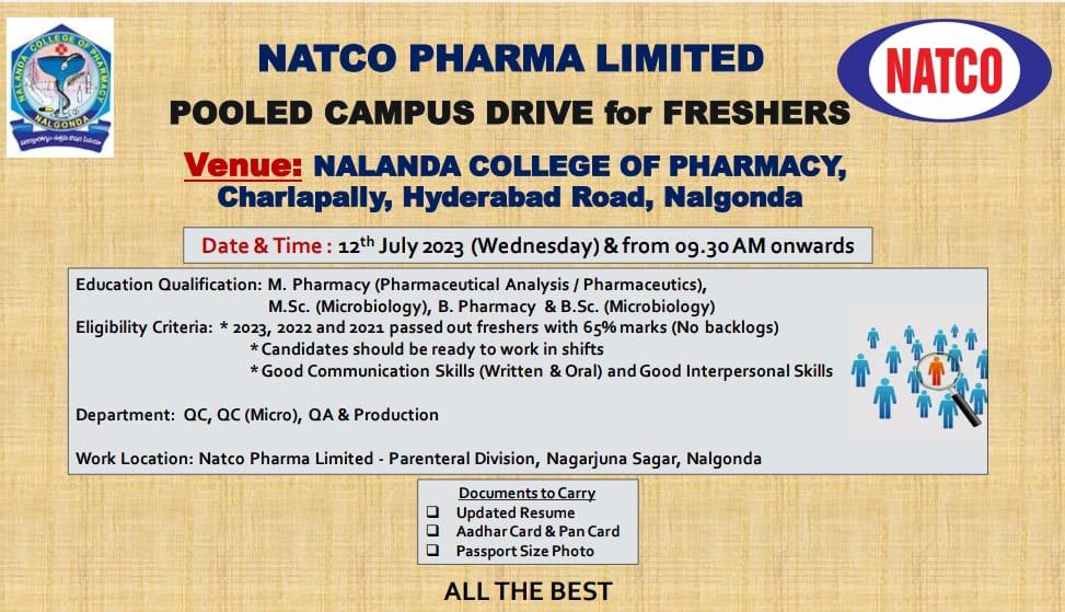 NATCO PHARMA – POOLED CAMPUS DRIVE for FRESHERS on 12th July 2023