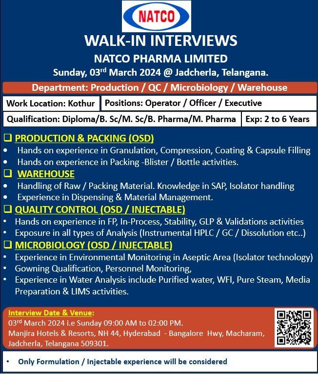 Walk-in at Jadcheral, Mahabubnagar, Telangana on 3rd March,2024 for Production (OSD), Production Packing-(OSD), Warehouse (OSD&Injectable), QC & Micro (OSD&Injectable) to work at Kothur Plant (near Shamshabad).