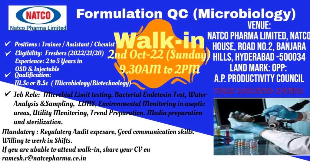 NATCO PHARMA Walk In for Trainee / Assistant / Chemist – Formulation QC (Microbiology) department on 2nd Oct-22 (Sunday)