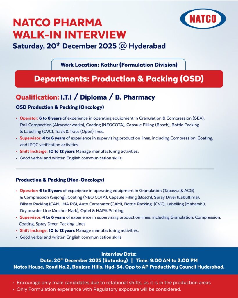 Natco Pharma Limited is hosting a mega walk-in interview drive on Saturday, 20th December 2025, for its Formulation Division located in Kothur. This recruitment drive focuses on the Production and Packing (OSD) departments for both Oncology and Non-Oncology units.