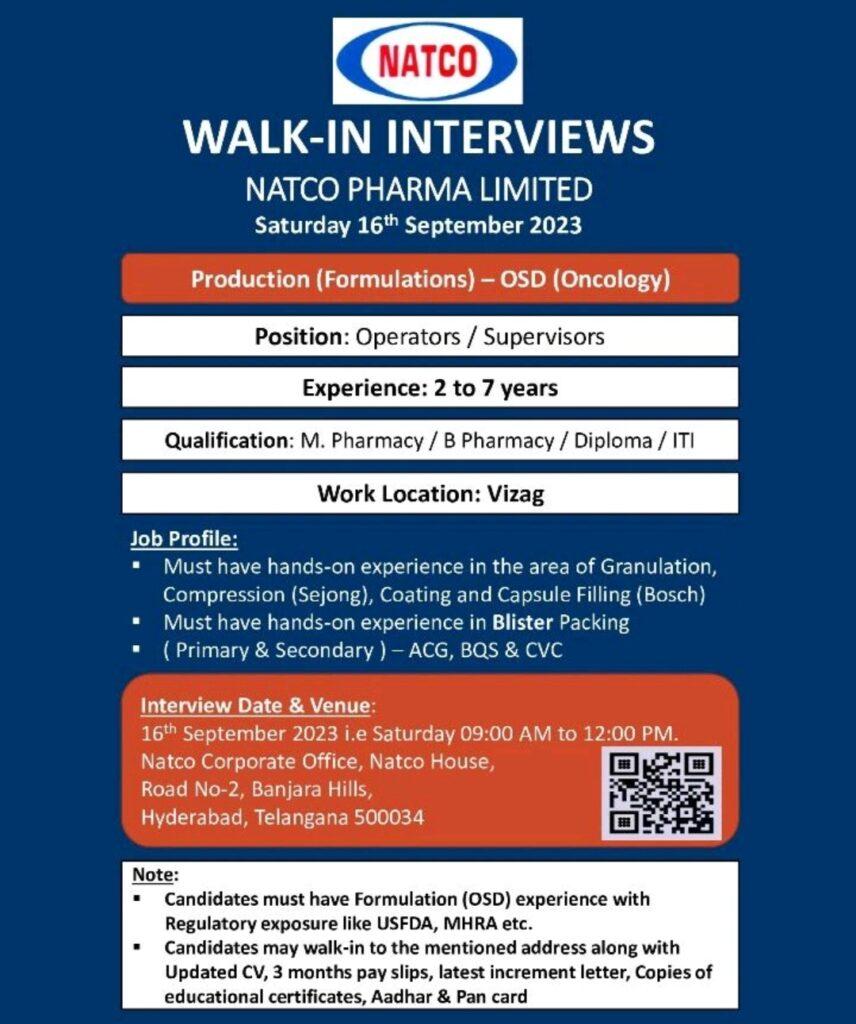 NATCO PHARMA – Walk In Interview for Operators / Supervisors – Production (Formulations) – OSD on 16th September 2023