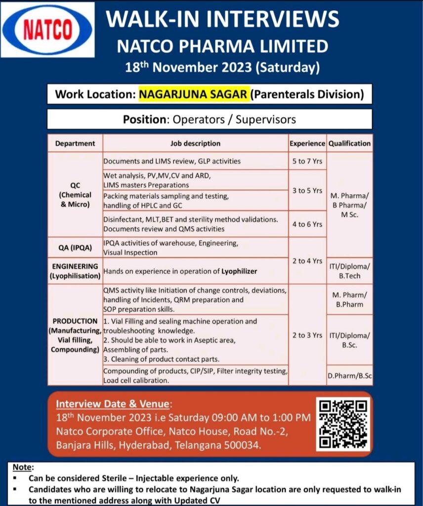 NATCO Pharma walk in interview for QA, QC, Micro, Production, Engineering department on 18th November 2023 (Saturday)