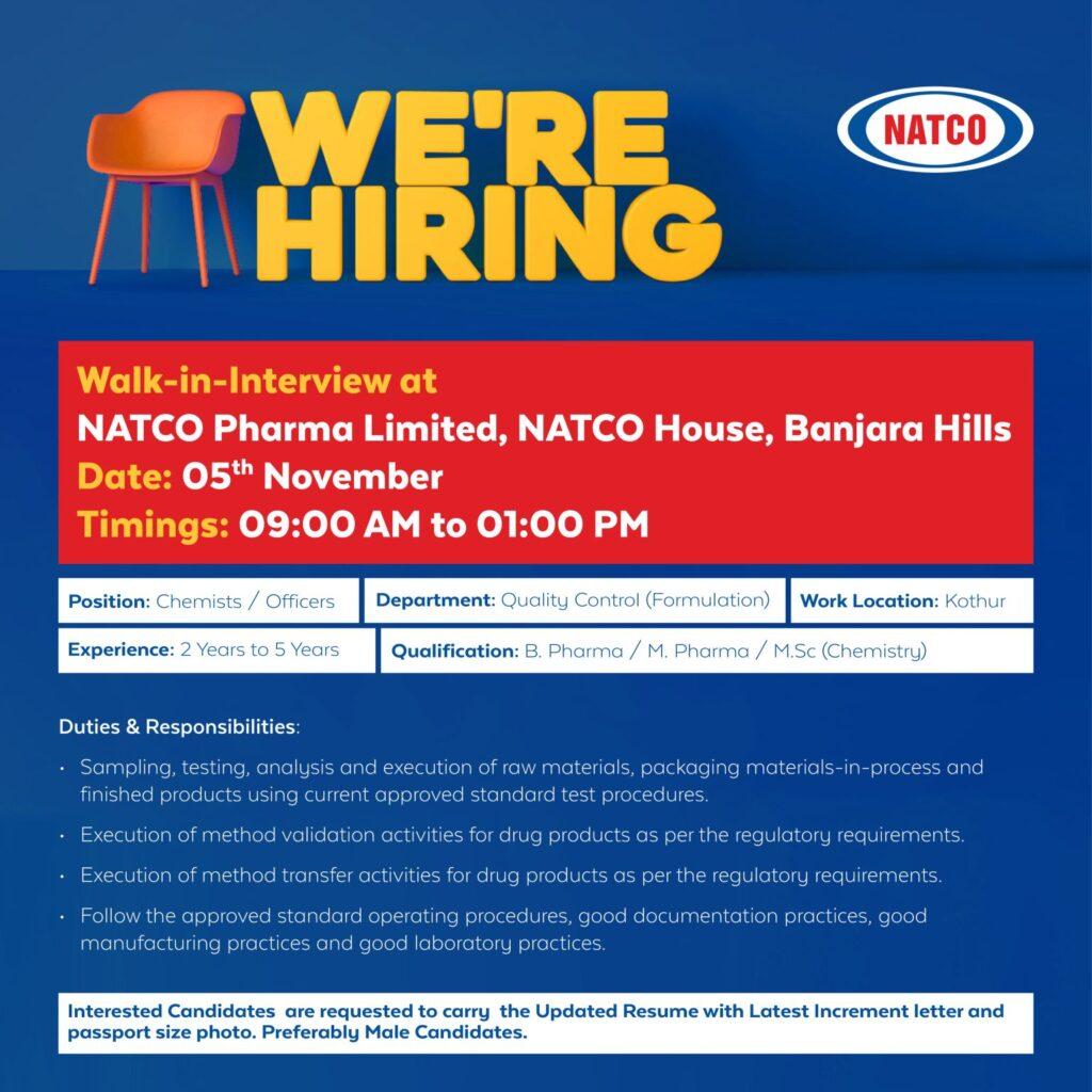 NATCO Pharma Walk-in-Interview for Quality Control (Formulation) department on 05th November 2022