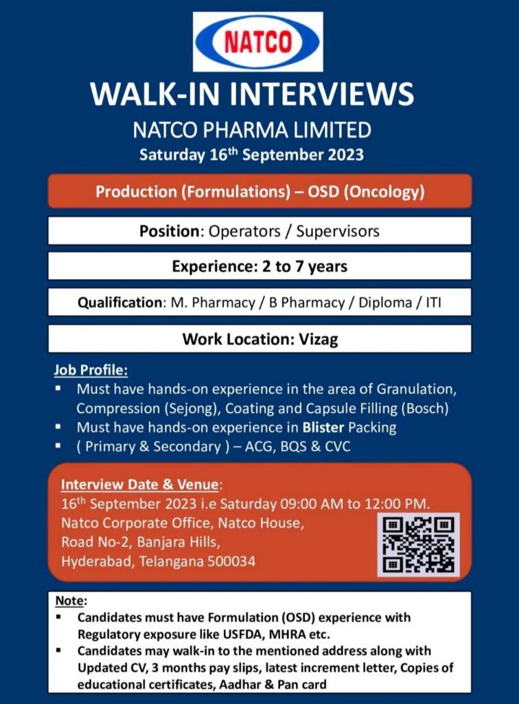 Natco Pharma – Walk-in Interviews for Production (OSD) department for Vizag plant on 16th September 2023