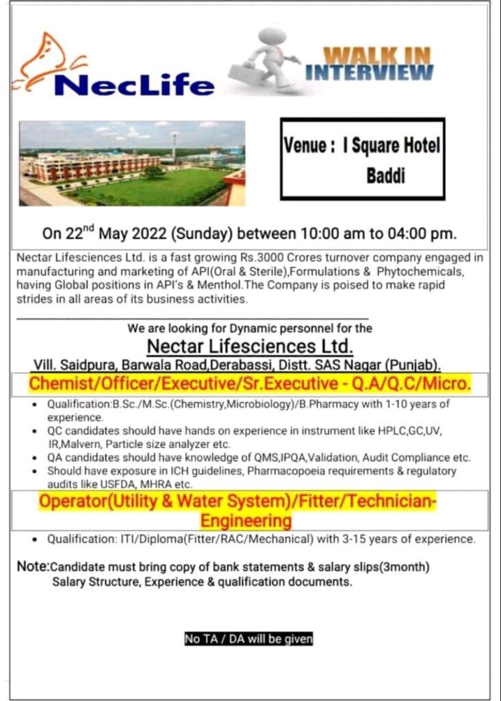 Nectar Lifesciences Ltd. Walk In Interview for Q.A/ Q.C /Micro & Engineering on 22nd May 2022 (Sunday)