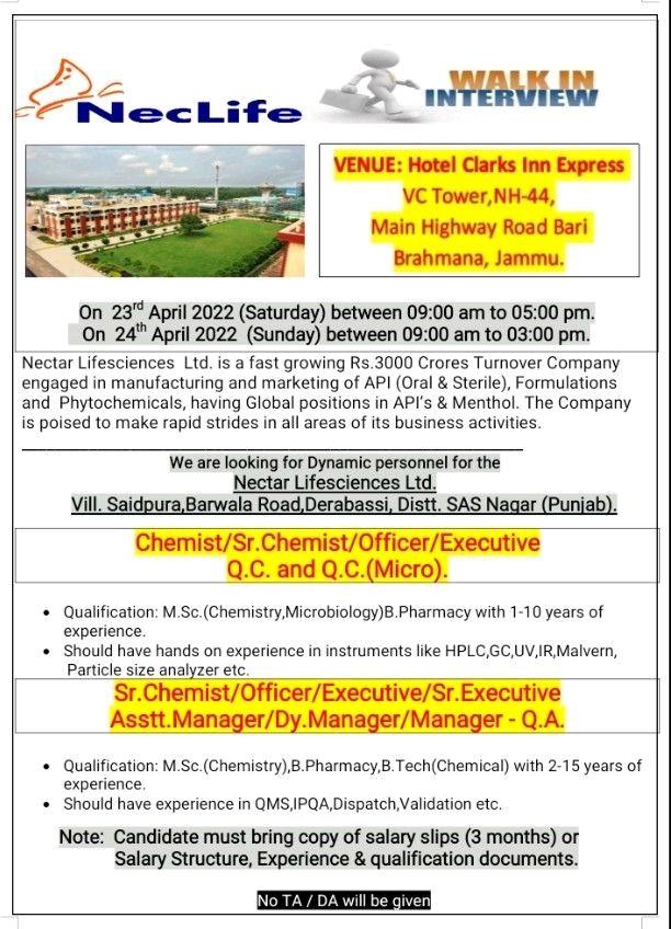 Nectar Lifesciences Ltd. WALK IN INTERVIEW on 23rd & 24th April 2022 @Jammu