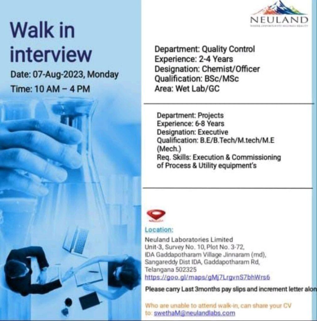 Who are unable to attend walk-in, can share your CV to: swethaM@neulandlabs.com